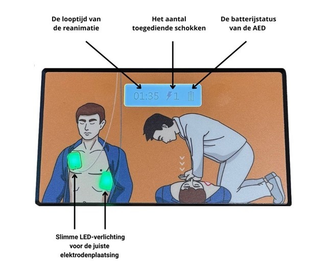 Twee knoppen naast het scherm maken het navigeren door de verschillende opties snel en eenvoudig. Tijdens de inzet geeft de AED visuele aanwijzingen bij het plaatsen van de elektroden: knipperende lampjes duiden aan dat de elektroden niet goed zijn aangebracht, terwijl continu groene lampjes bevestigen dat alles correct is aangesloten.