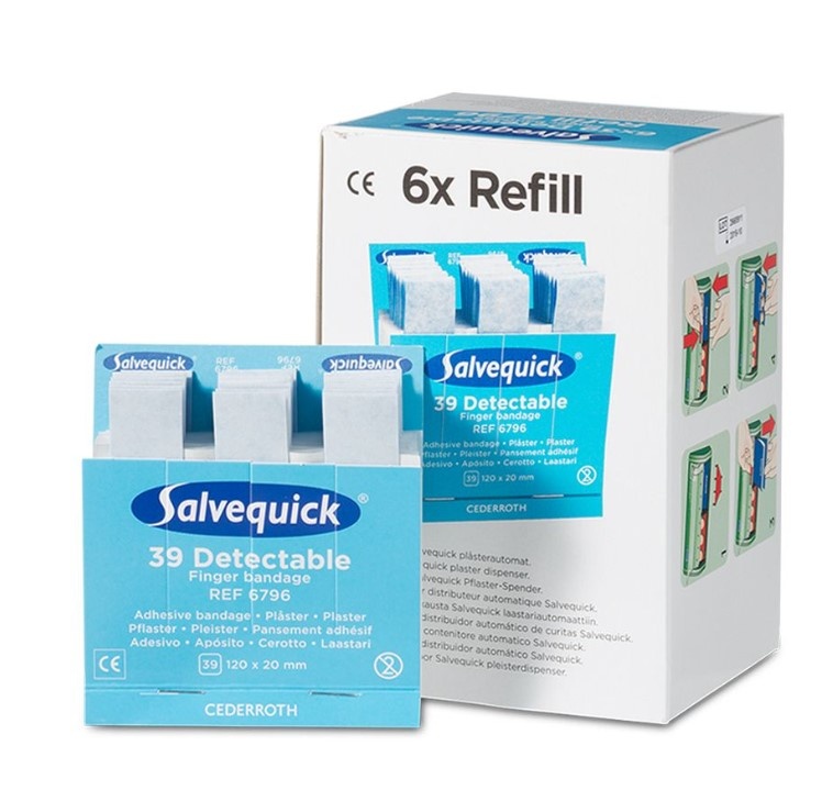 Als u een pleister uit de navulling trekt, komt het kleefvlak automatisch vrij. Gebruik deze Salvequick 6796 vingerpleisters als HACCP-navulling van uw Salvequick pleisterautomaat.